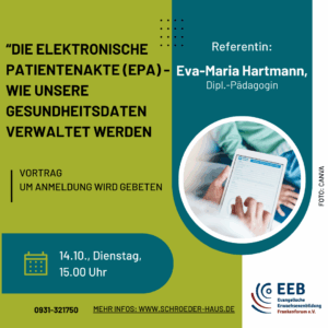 Die elektronische Patientenakte (ePA) ist ein zentraler Baustein der digitalen Transformation im Gesundheitswesen. Sie ermöglicht es Patientinnen und Patienten, ihre Gesundheitsdaten jederzeit digital einzusehen und medizinischen Fachkräften zur Verfügung zu stellen. Doch wie funktioniert die ePA genau? Welche Vorteile und Herausforderungen bringt sie mit sich? Gesundheitsdaten sind die sensibelsten und schutzwürdigsten Daten überhaupt, deshalb nehmen wir die Sicherheit unserer Daten besonders unter die Lupe. In dieser Veranstaltung erfahren Sie alles Wichtige zur ePA, ihren Funktionen und Nutzungsmöglichkeiten und aktuellen gesetzlichen Regelungen.