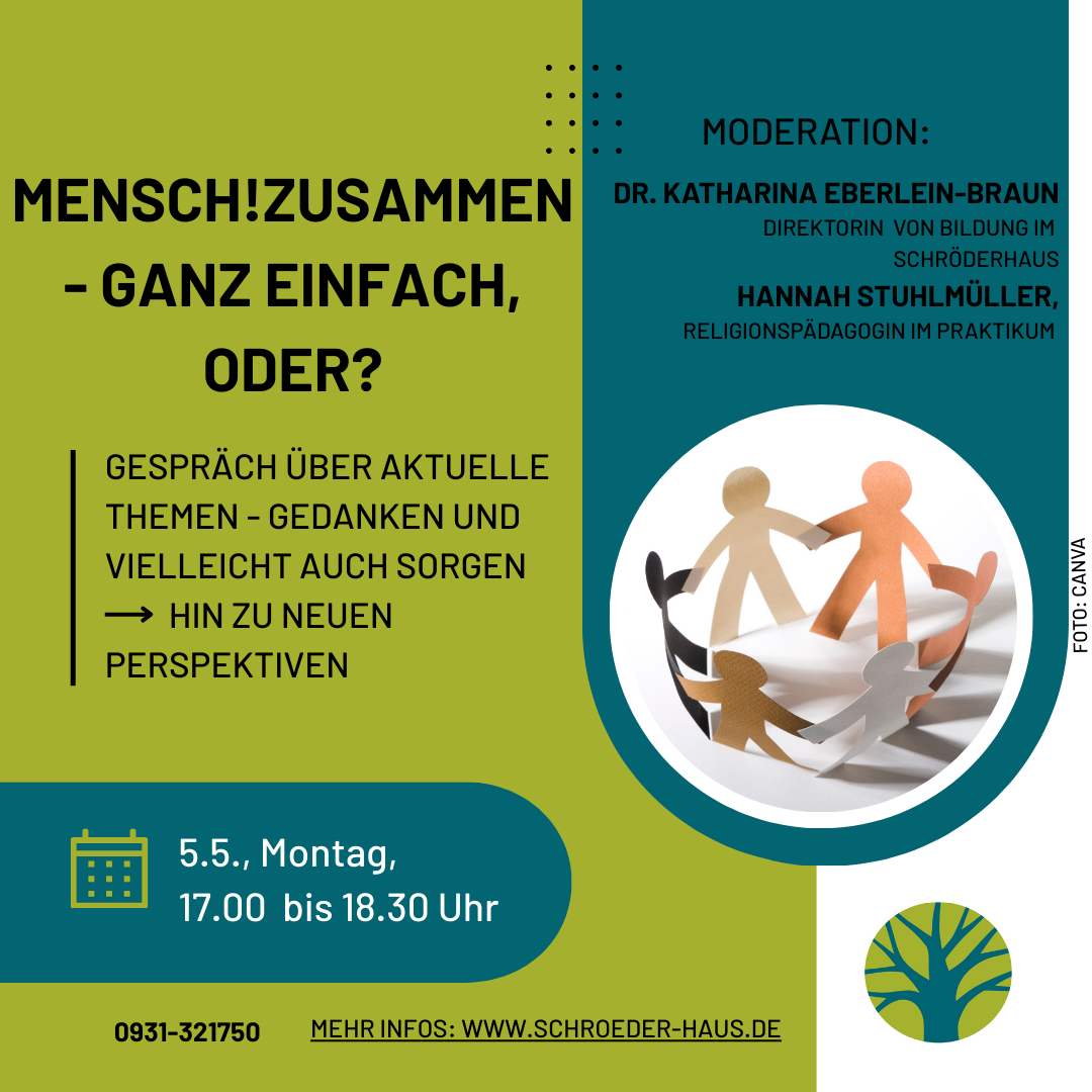 Im Schröder-Haus soll ein Platz für Freundlichkeit und Kooperation sein. Damit sie nicht dem Zufall überlassen bleiben. "Mensch!Zusammen" ist ein Gesprächsformat, bei dem alle willkommen sind, die sich Gedanken und vielleicht Sorgen um unsere Gesellschaft machen und denen es wichtig ist, offen für andere Menschen zu sein, egal welcher Herkunft und Lebenssituation. Herzliche Einladung! Wir treffen uns einmal im Monat. Am Anfang wird ein aktuelles Thema kurz eingeführt, über das wir uns dann angeleitet austauschen und im Gespräch weitere, gemeinschaftsfördernde Perspektiven entdecken und weiterentwickeln