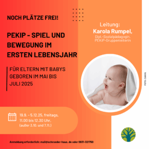 In der "Prager-Eltern-Kind-Programm-Gruppe" werden Spiel- und Bewegungsmöglichkeiten angeboten, die dem Entwicklungsstand Ihres Babys entsprechen. Gleichzeitig besteht die Möglichkeit zum Knüpfen neuer Kontakte und gemeinsamen Austausch über Fragen der Pflege, Erziehung, Ernährung und Entwicklung. Weitere Infos unter https://www.pekip.de. Der Raum ist gut geheizt und wird regelmäßig gelüftet, denken Sie an entsprechende Kleidung für sich selbst.