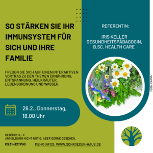 Stärken Sie Ihr Immunsystem mit dem Naturheilverfahren nach Sebastian Kneipp. Lernen Sie das Konzept neu kennen, denn Kneipp bedeutet vielmehr als kalte Wasseranwendungen. Freuen Sie sich auf einen interaktiven Vortrag zu den Themen Ernährung, Entspannung, Heilkräuter, Lebensordnung und Wasser.