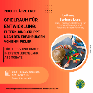 In einer vorbereiteten ruhigen Umgebung laden einfache Spielmaterialien, Krabbel- und Klettergeräten zum selbstständigen Erkunden, Hantieren und Bewegen ein. Hier können Babys und Kleinkinder ihren Körper erleben, Bewegung selbständig entwickeln, Ruhe finden und sich in Beziehung zu anderen kennenlernen. Dies im eigenen Tempo und aus eigenen Impulsen heraus tun zu können unterstützt ein gesundes Selbstwertgefühl. Gefühle und Konflikte sind erlaubt und werden von der Leiterin respektvoll begleitet. Für Sie als Eltern bietet der SpielRaum eine besondere Erfahrung: Sie dürfen sich zurücklehnen, beobachten und entdecken, wie kompetent ihr Kind bereits ist. Die Eigenaktivität der Kinder zu erleben, macht Freude, stärkt Vertrauen und Beziehung. Es entsteht eine Atmosphäre, in der sowohl Kinder als auch Eltern wachsen können.