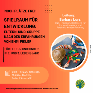 In einer vorbereiteten ruhigen Umgebung laden einfache Spielmaterialien, Krabbel- und Klettergeräten zum selbstständigen Erkunden, Hantieren und Bewegen ein. Hier können Babys und Kleinkinder ihren Körper erleben, Bewegung selbständig entwickeln, Ruhe finden und sich in Beziehung zu anderen kennenlernen. Dies im eigenen Tempo und aus eigenen Impulsen heraus tun zu können unterstützt ein gesundes Selbstwertgefühl. Gefühle und Konflikte sind erlaubt und werden von der Leiterin respektvoll begleitet. Für Sie als Eltern bietet der SpielRaum eine besondere Erfahrung: Sie dürfen sich zurücklehnen, beobachten und entdecken, wie kompetent ihr Kind bereits ist. Die Eigenaktivität der Kinder zu erleben, macht Freude, stärkt Vertrauen und Beziehung. Es entsteht eine Atmosphäre, in der sowohl Kinder als auch Eltern wachsen können.